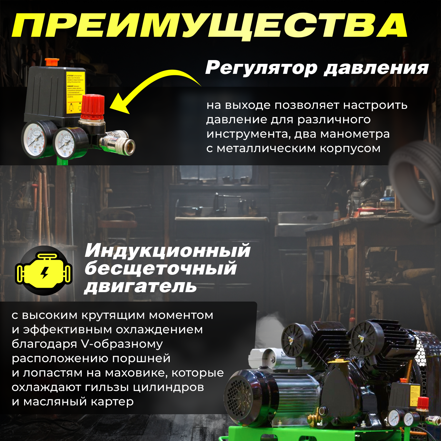 | Плюсы: | Очень производительный, 380 л/минуту, быстро нагнетает давление до максимальных 8 атм, нигде не травит. Подойдет как для покраски площадей, так и для пневмоинструмента. В эксплуатации простой, кроме периодической своевременной замены масла ничего не требуется. |