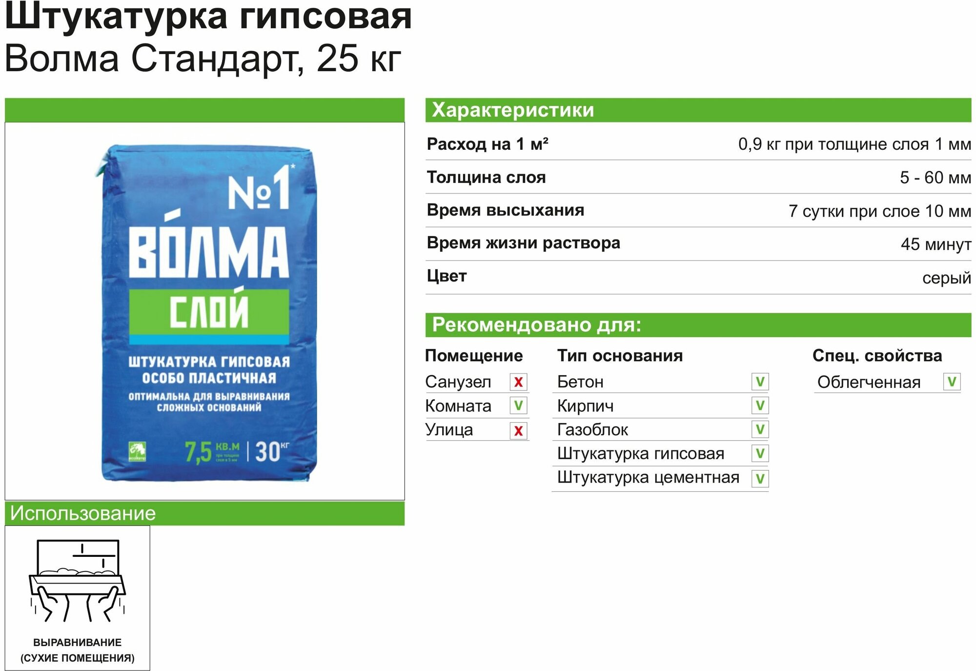 | Дополнительная информация | ГОСТ Р 58279-2018; мешки с сухой штукатурной смесью «ВОЛМА-Слой» хранить на деревянных поддонах в сухих помещениях. |