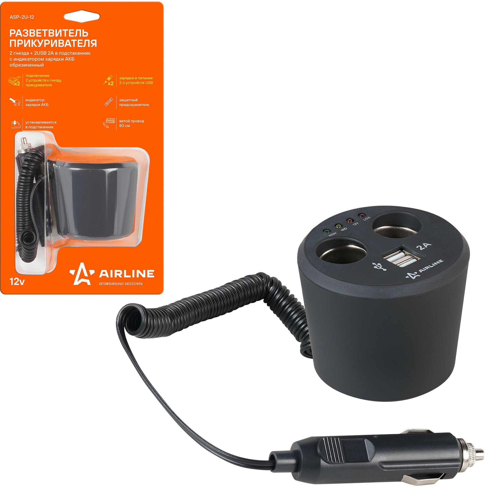 AIRLINE ASP2U12 прикуриватель-разветвитель 2 гнезда + 2USB В подстаканник С индикат.заряд.АКБ обрезин. (ASP-2U-12)