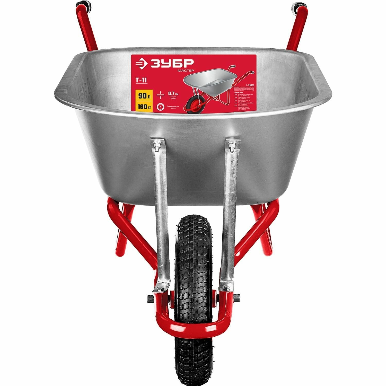 ЗУБР Т-11, 90 л, 160 кг, одноколесная, оцинкованная сталь, стальные опоры Ø25мм, садово-строительная тачка (39962)