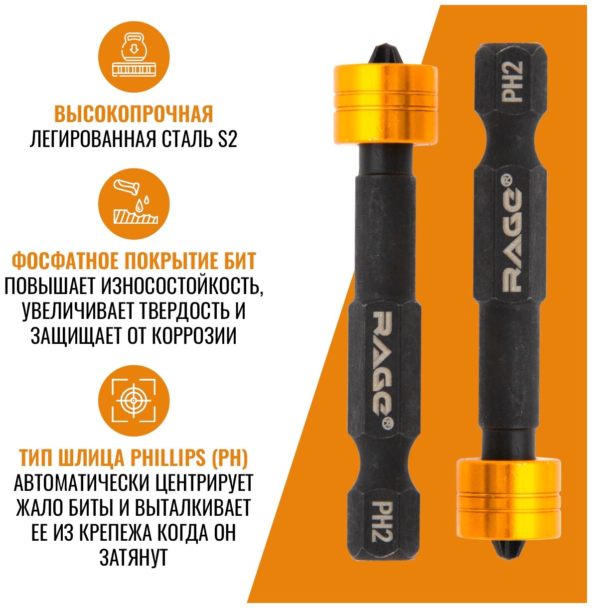 Биты магнитные с ограничителем (2 шт; PH2x50 мм; S2) RAGE by VIRA 554133