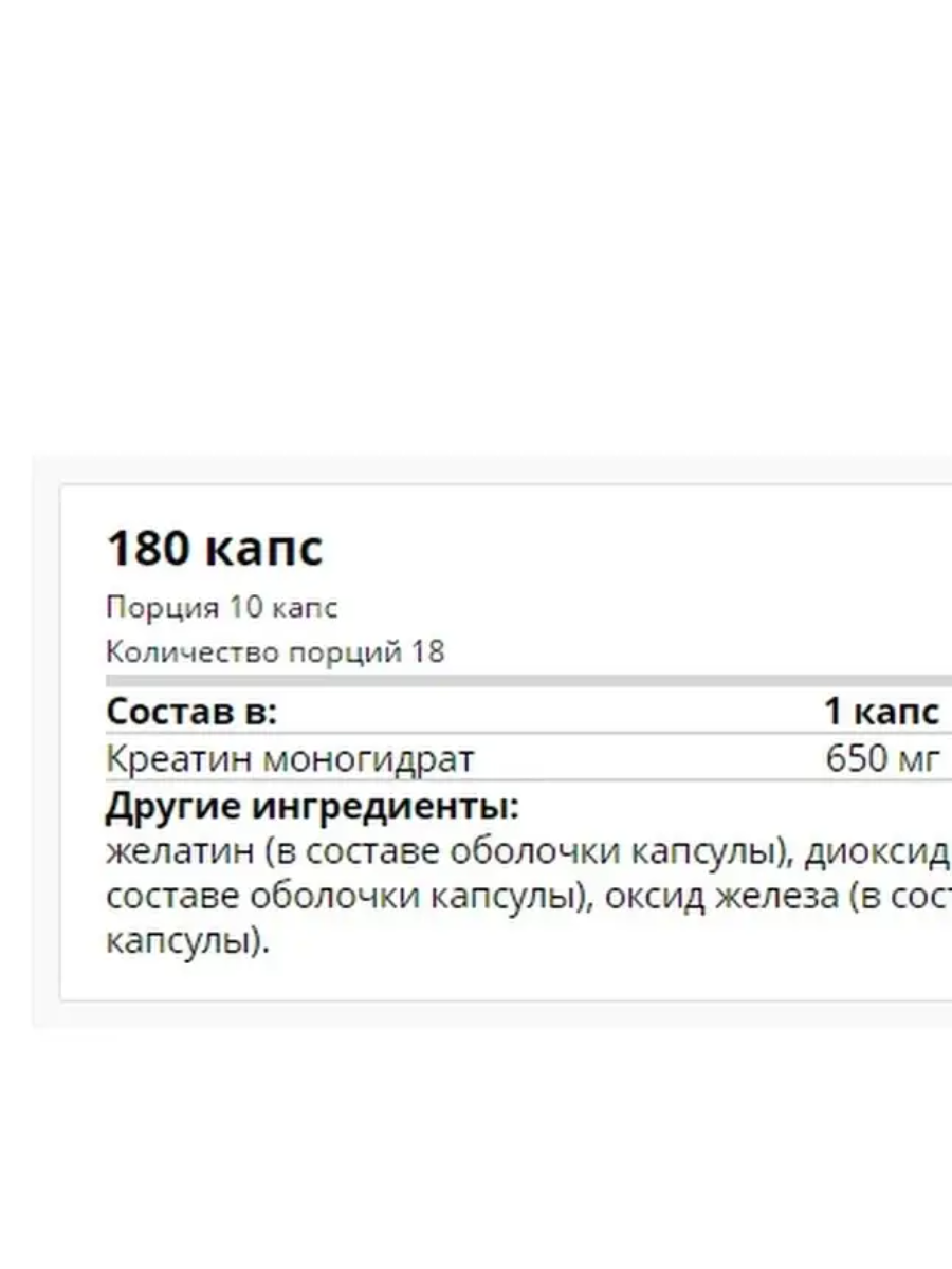 | Дополнительная информация | размер порции: 10 шт.; рекомендации по применению: взрослым по 30 капсул в день во время еды; продолжительность приема 4 недели; состав: креатин моногидрат, оболочка (желатин, оксид железа, диоксид титана) |