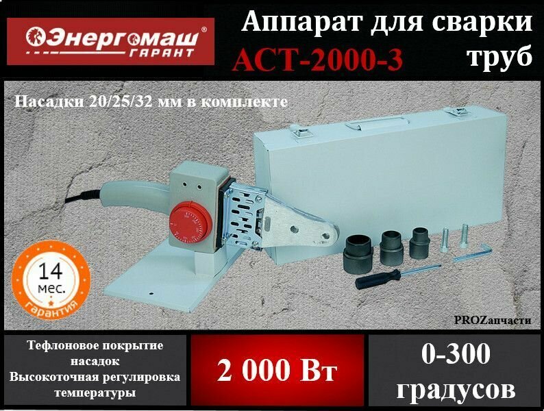 Аппарат для сварки пластиковых труб Энергомаш АСТ-2000-3 (2кВт, 3 насадки, 20-25-32 мм, кейс)