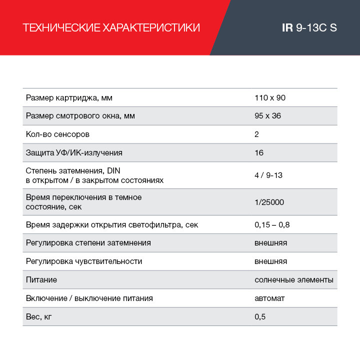 | Степень затемнения | 9 DIN - 13 DIN |