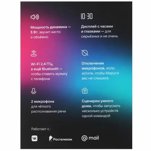 | Плюсы: | Колонка мощная для своего размера. Маруся рассказывает сказки, травит анекдоты, даже без подписки. Подключается, как блютуз |