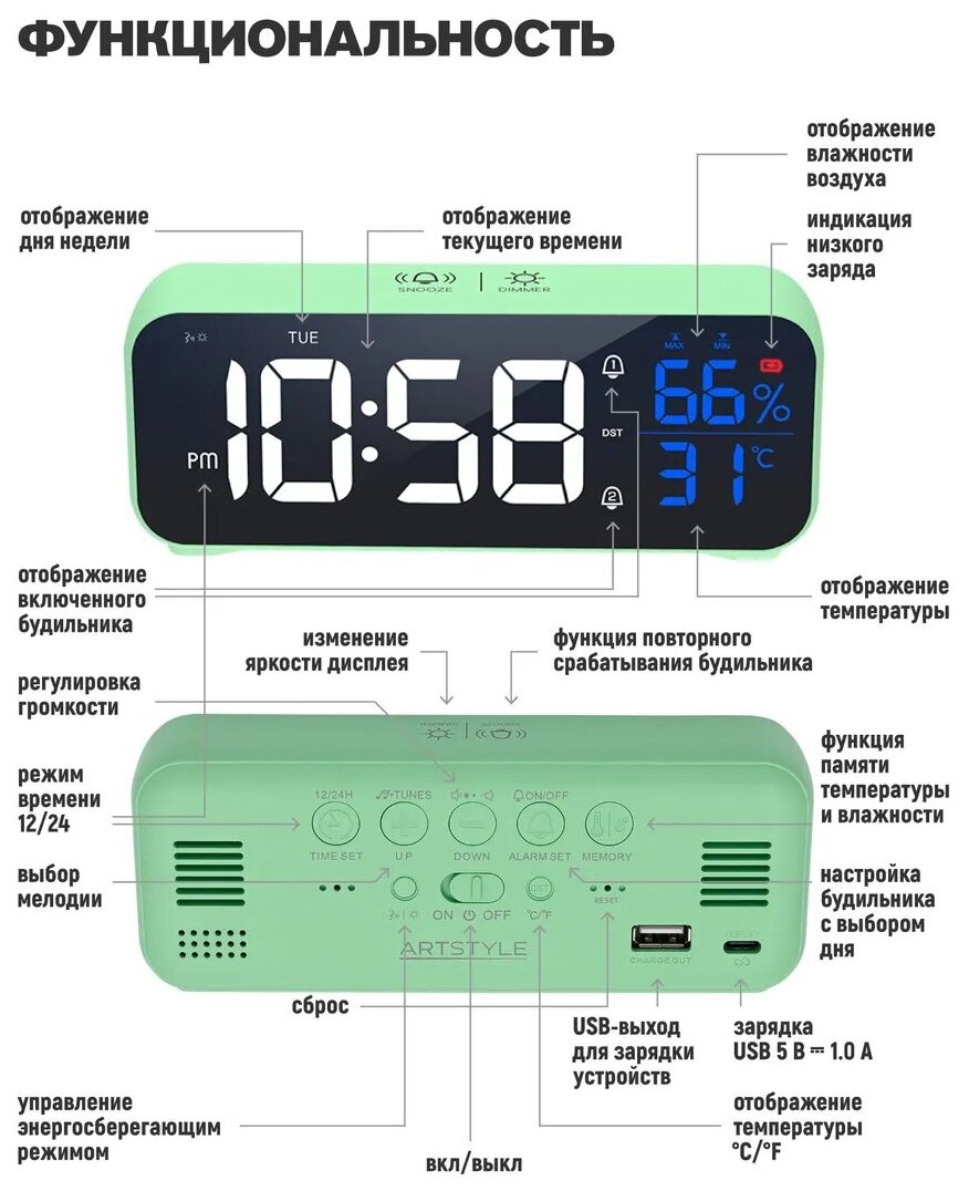 Часы электронные, CL-82GRW, ARTSTYLE, зеленые, со встр. аккум., инд. - бел./син., с будильником, термо- и гигрометром