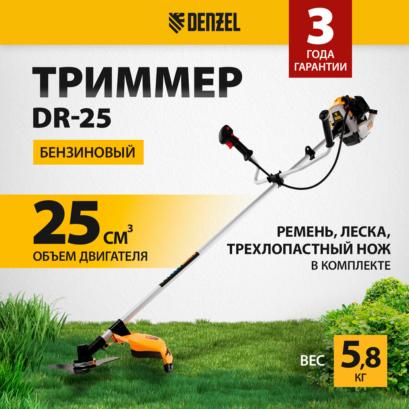 Триммер бензиновый DENZEL DR-25, 25 см3, неразъемная штанга