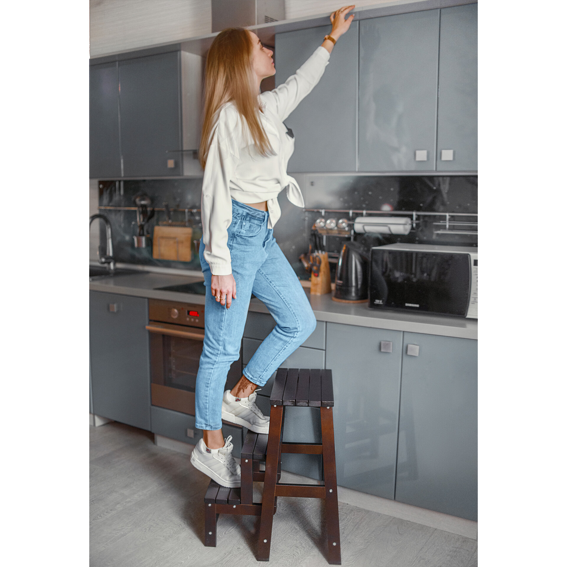 | Плюсы: | Красивая незаменимая стремянка на кухне да и вообще в квартире. Компактная, покрыта лаком, легко оттирается грязь. |
