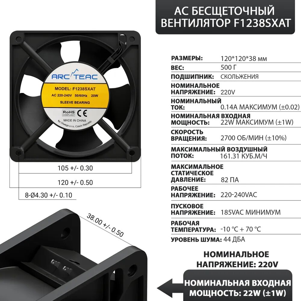 Вентилятор осевой для сети переменного тока, кулер ARCTEAC F1238SXAT, 22Вт, скольжения, 2700об/мин, коннектор, 1шт