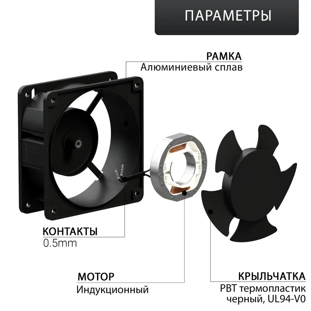 | Дополнительная информация | для сети переменного тока; номинальный ток: 0.14 A (±0.02%); статическое давление: 8,38 мм H2O; подключение: коннекторы 2.8x0.3 мм; крыльчатка: пластик PBT UL 94V-0, 5 лопастей; скорость вращения 2700 об./мин; подшипник скольжения |