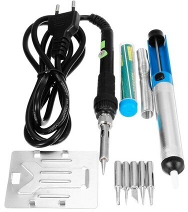 очиститель, пинцет, экстрактор припоя, 5 сменных жал, подставка для паяльника, кейс, канифоль, припой, руководство пользователя