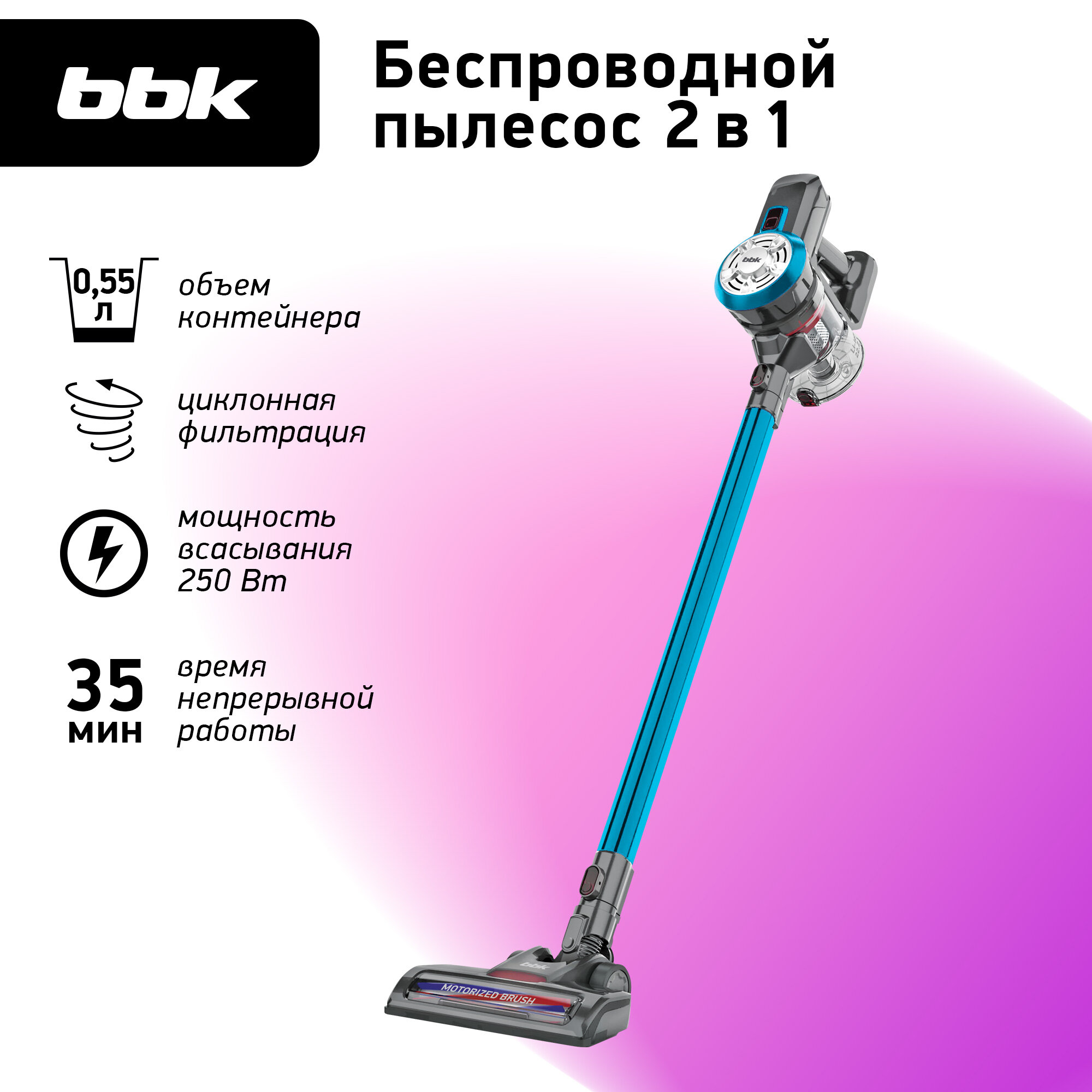 СохранитьВертикальный беспроводной пылесос "2 в 1" BBK BV2527 бирюзовый, мощность всасывания 250 Вт, объем пылесборника 0,55 л, сухая уборка интересное: