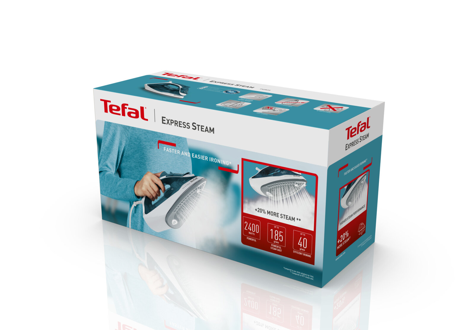 Паровой утюг Tefal Express Steam FV2839E0 с вертикальным отпариванием, паровым ударом 185 г/мин, 2400 Вт, бирюзовый