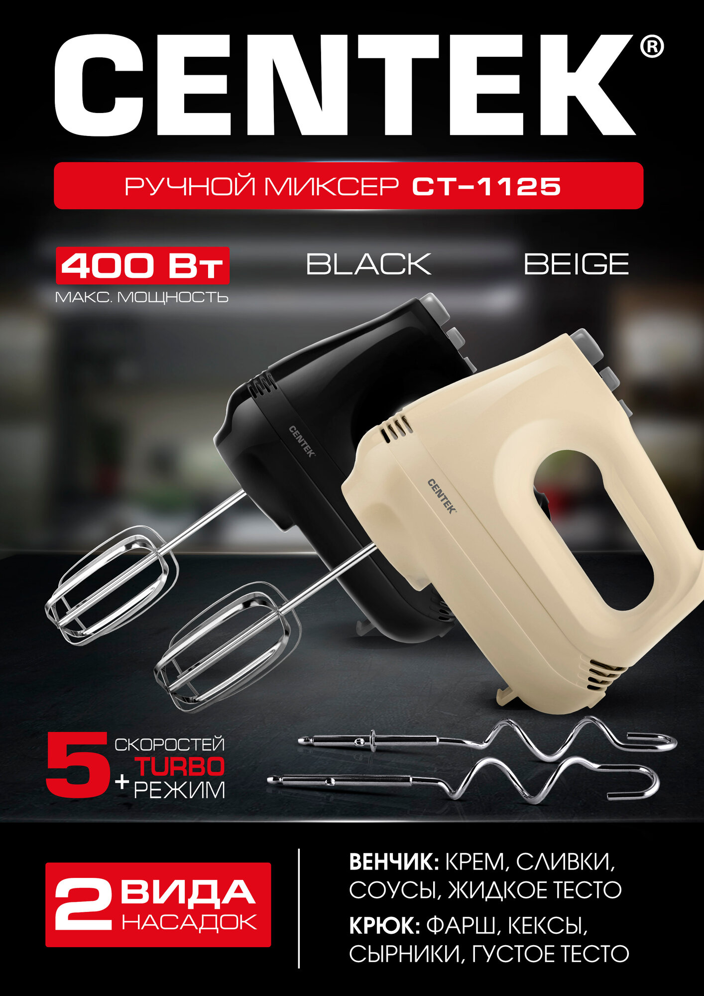 Миксер Centek CT-1125 (бежевый) 400Вт, 5 скоростей + турбо режим, взбивание/замешивание
