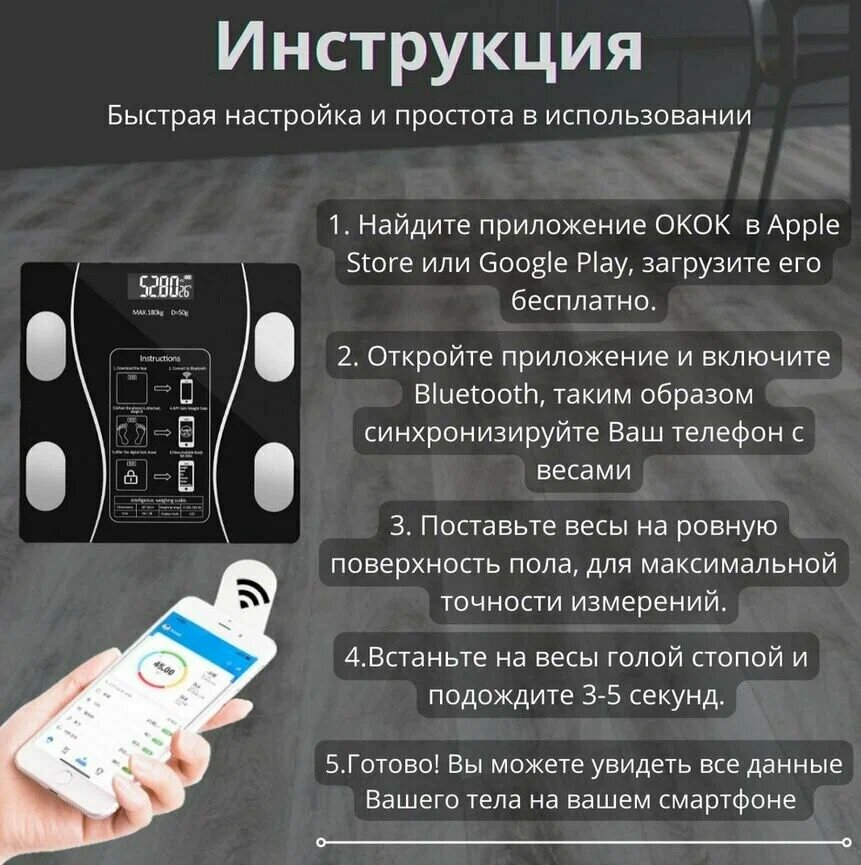 Ожидание и реальность. Весы просто супер лучше чем на фото. Очень просты к установке, достаточно отсканировать код и приложения у вас в телефоне. Я настроила под себя, а супруга через меню гость.) рекомендую. Программа показывает реальную информацию проверено)