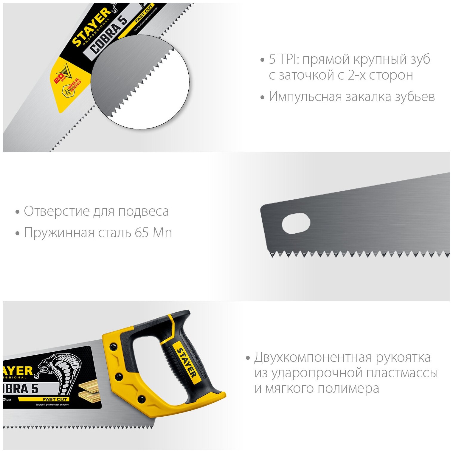 Ножовка по дереву STAYER Cobra 5, 500мм, 5 TPI, прямой каленый зуб, двухкомпонентная рукоятка (1506-50 z01)