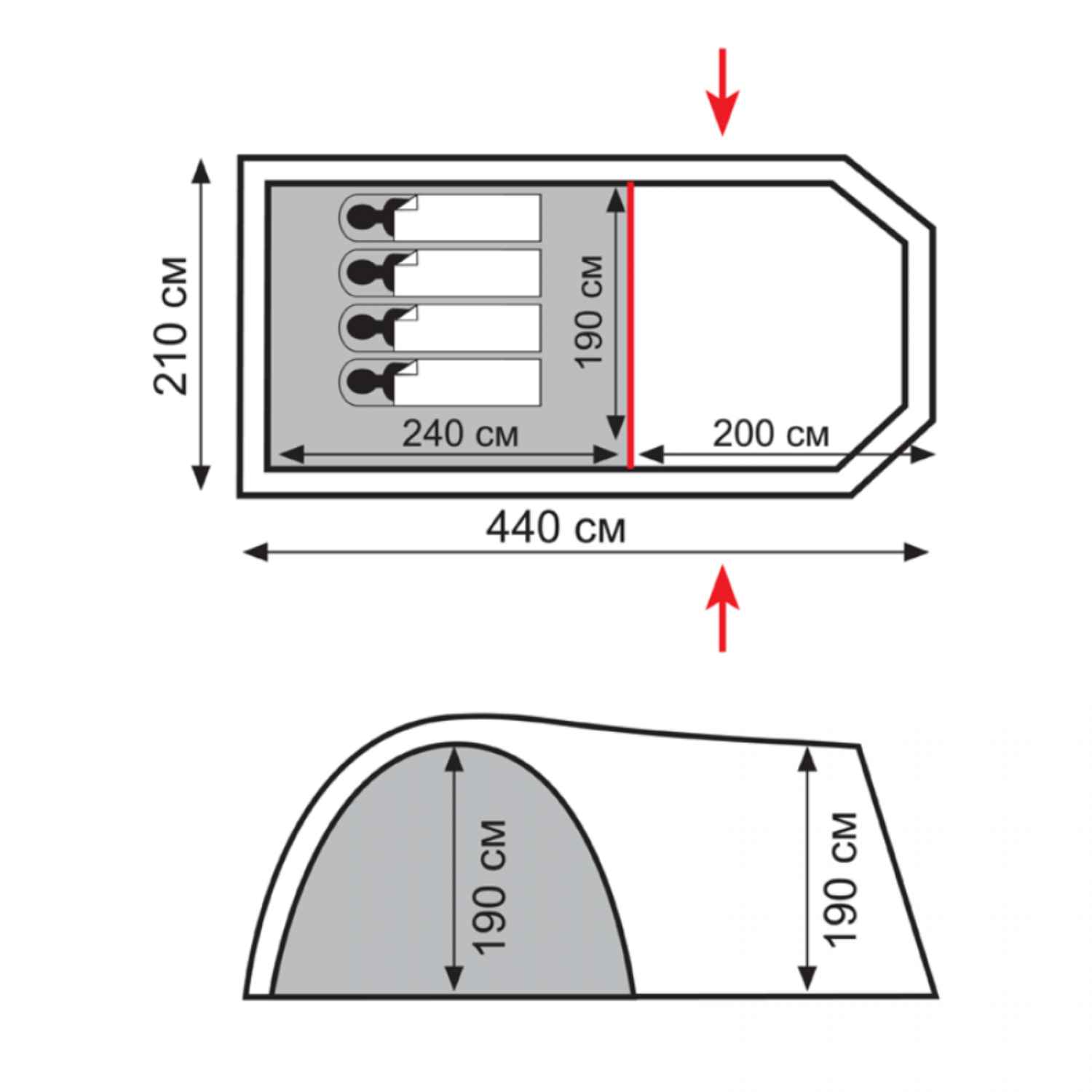 | Габариты внешней палатки(ДxШxВ) | 440x210x190 cм |