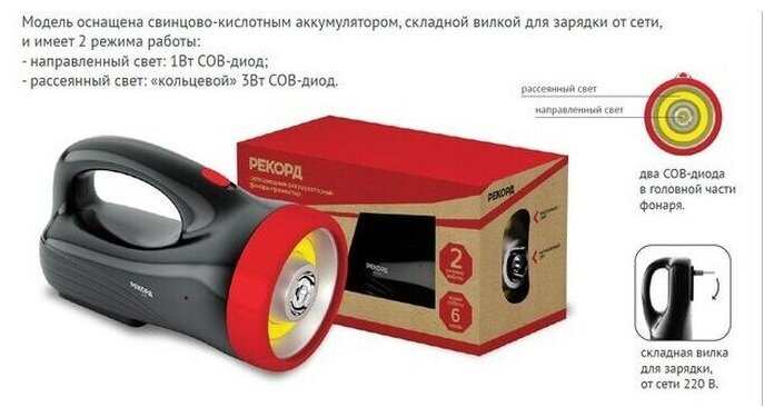 Фонарь прожектор Рекорд PВ-3200 (23206) светодиодный 2 LED 4 Вт аккумуляторный SLA 1000 мАч пластик 2 режима