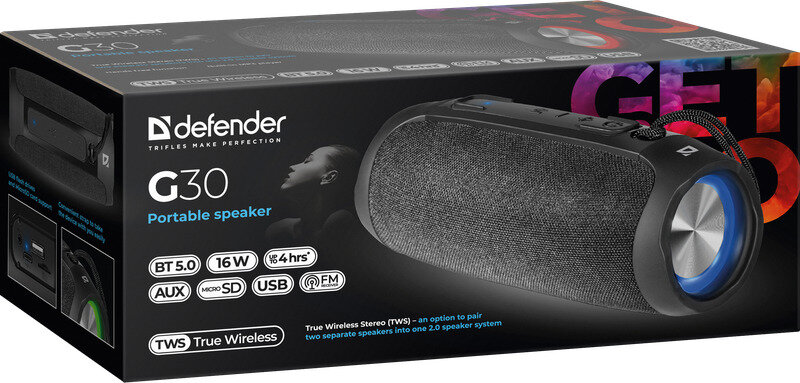 Ниже Вы можете прочитать отзывы на Портативная колонка Defender G30 ,16 Вт,BT/FM/USB/TF/AUX/Light,черный, ознакомится с подробными характеристиками, посмотреть интересные обзоры и фотографии на Портативная колонка Defender G30 ,16 Вт,BT/FM/USB/TF/AUX/Light,черный.