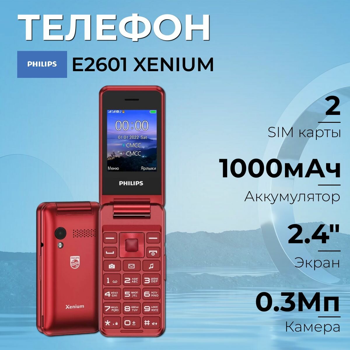 Мобильный телефон Philips Xenium E2601 раскладушка, 2Mini-SIM , Bluetooth, FM-радио, micro SD, 1000 мАч