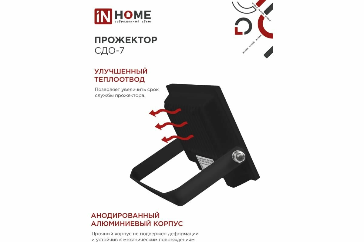 Прожектор светодиодный IN HOME СДО-7, 50 Вт, 230 В, 6500 К, IP65, белый