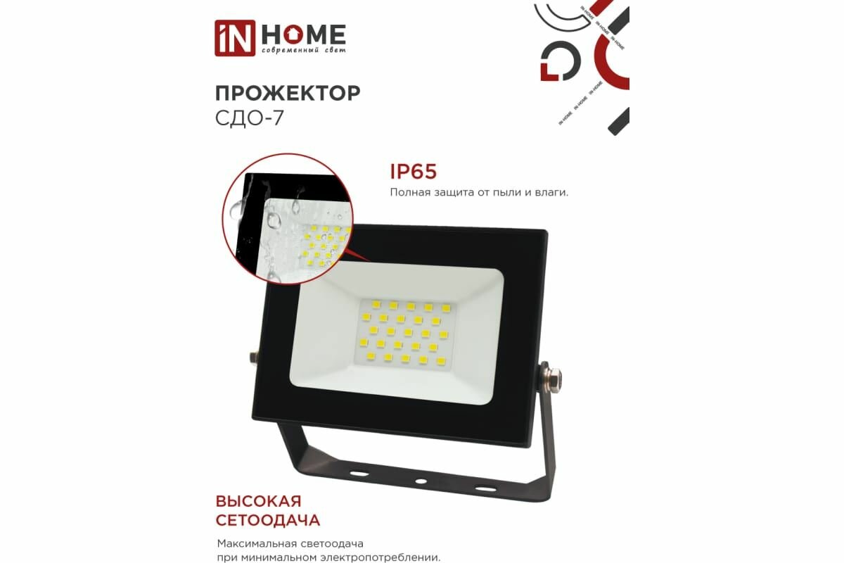 Прожектор светодиодный IN HOME СДО-7, 30 Вт, 230 В, 6500 К, IP65, белый