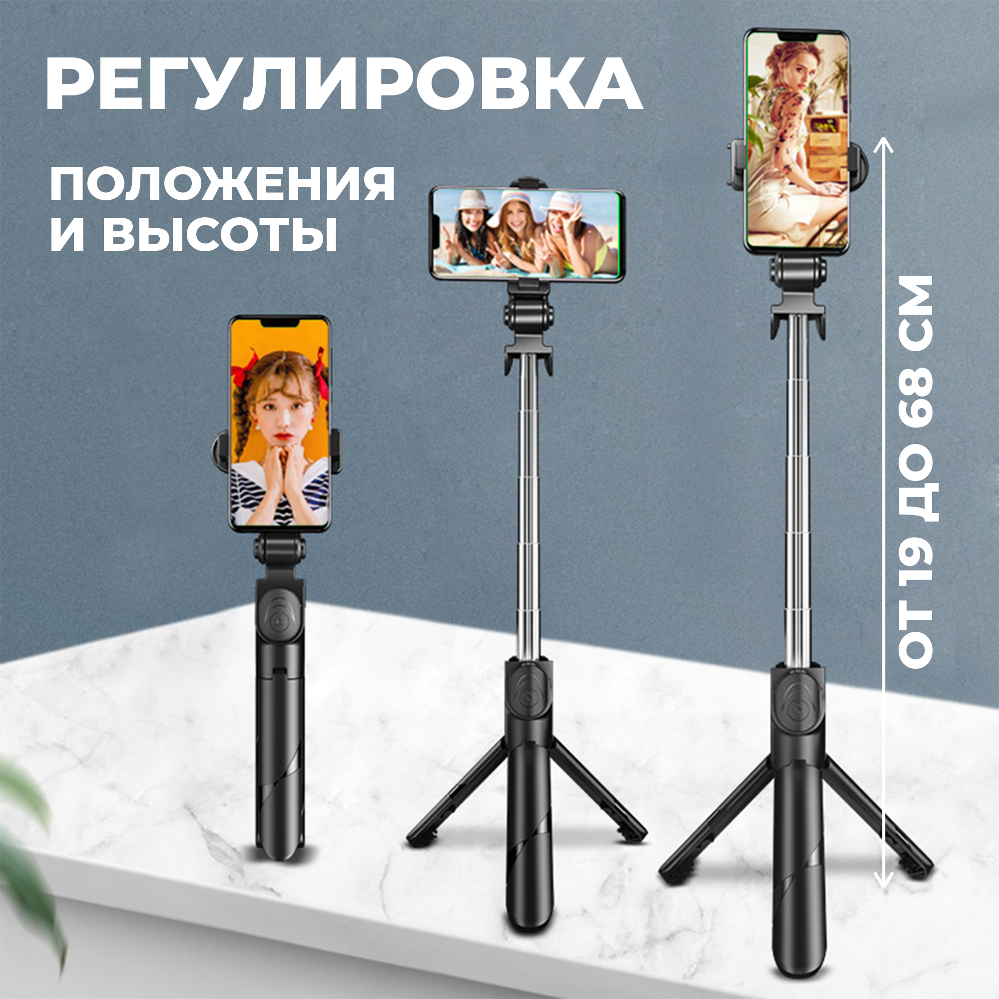 | Плюсы: | Очень удобный трипод, можно как держать в руке, так и поставить как триногу, при этом минимум манипуляций, прост в обращении. На коробке инструкция по настройке кнопки блютуз для спуска "затвора камеры" на русском языке. |