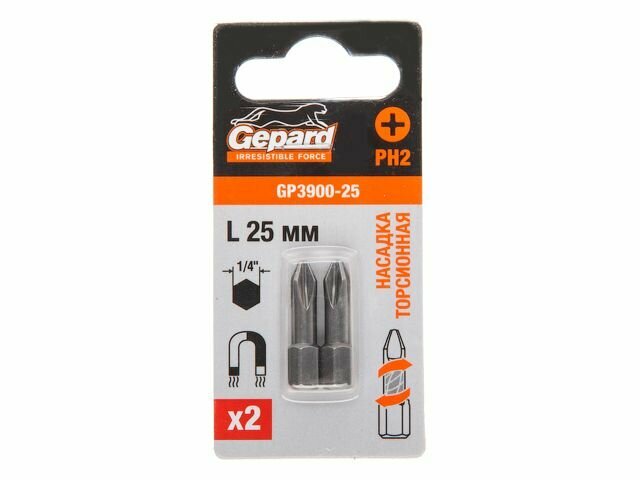 Насадка крестообразная PH2 25мм 2шт торсионная GEPARD (GP3900-25) (бита Phillips сталь S2 магнитная) интересное: