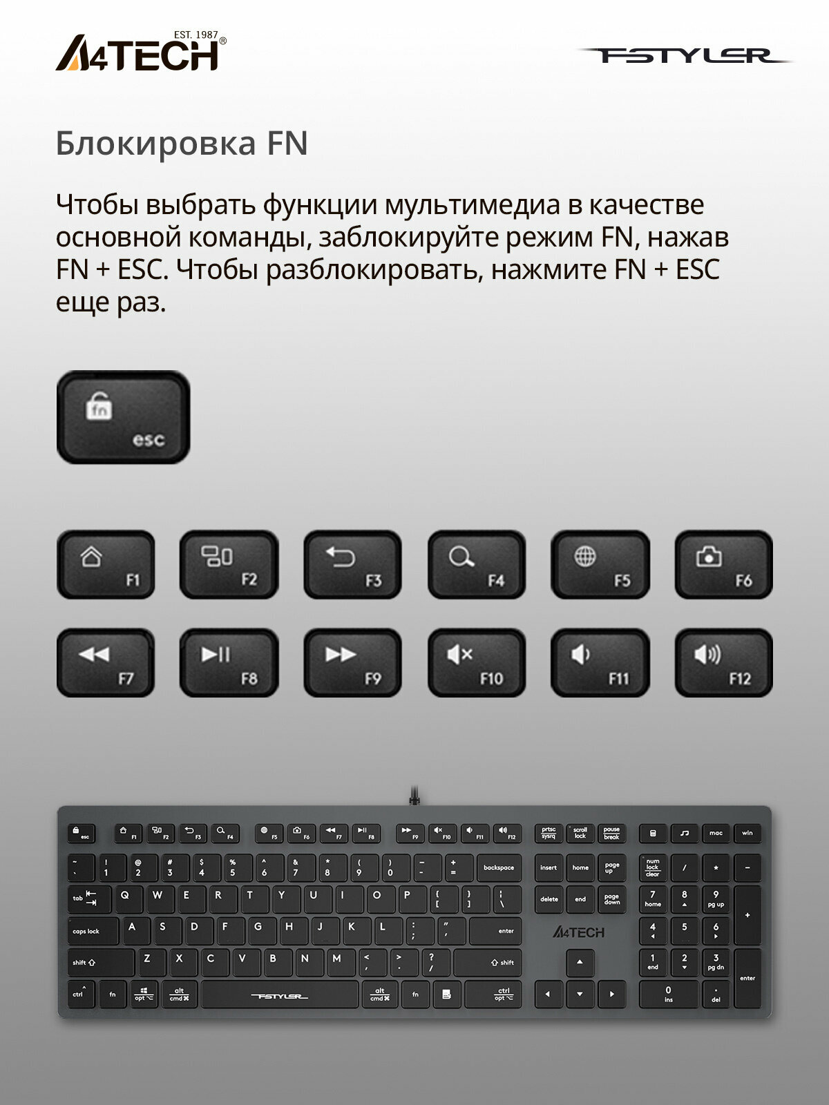 Клавиатура A4TECH Fstyler FX50 серый USB slim