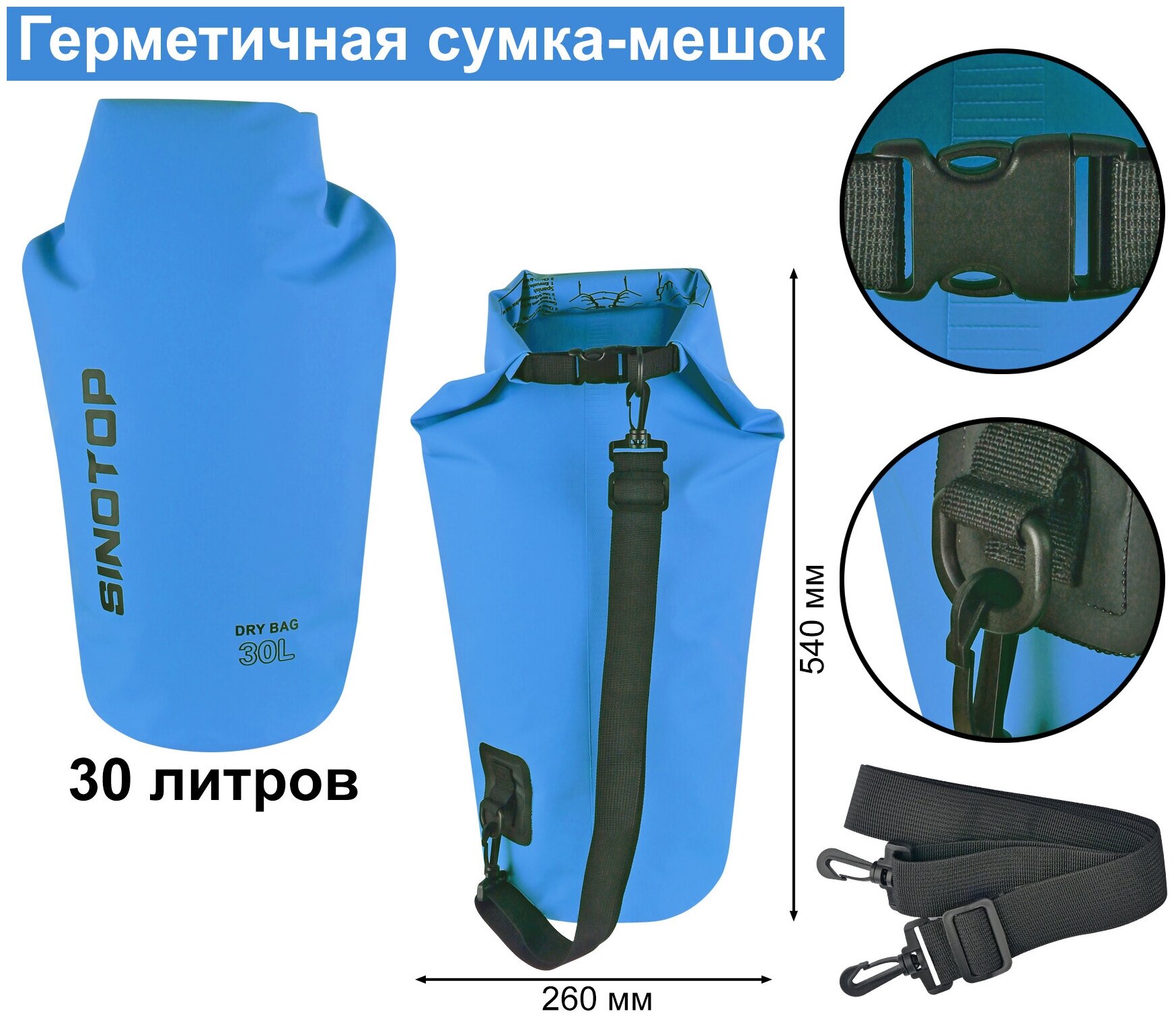 Гермомешок 30 л для туризма и рыбалки, кемпинга и охоты голубой Sinotop TM211001-30L/туристическая водонепроницаемая сумка-мешок для вещей в поход 30 литров 540x260 мм интересное: