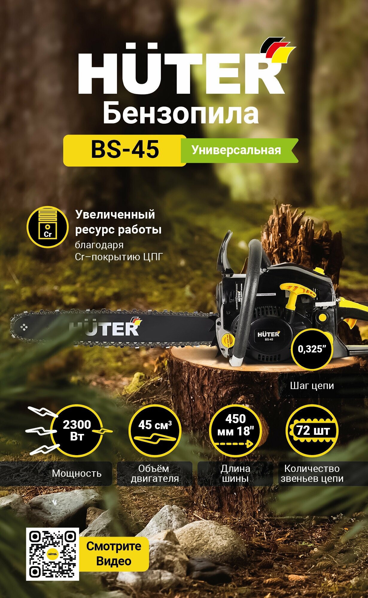 Бензопила BS-45 Huter (3.1 л.с, 45 см³, шина 45см, шаг цепи 0.325 дюйм)