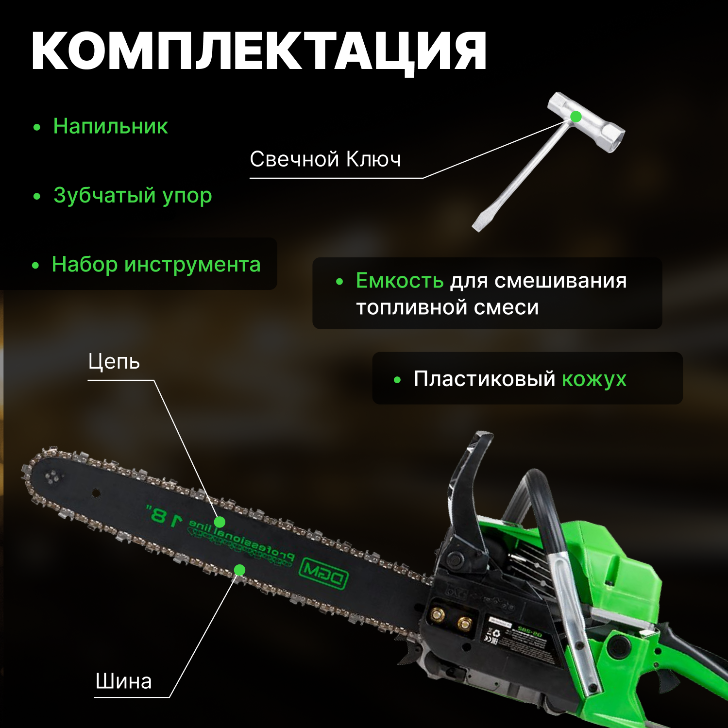 | Комплект поставки | цепь, шина, пластиковый кожух, зубчатый упор, cвечной ключ, емкость для смешивания топливной смеси, набор инструмента, напильник. |