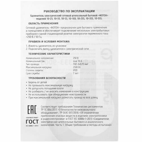 Фотон Удлинитель сетевой 10-23, 2м, 3 розетки, 10А, Белый 21110 интересное: