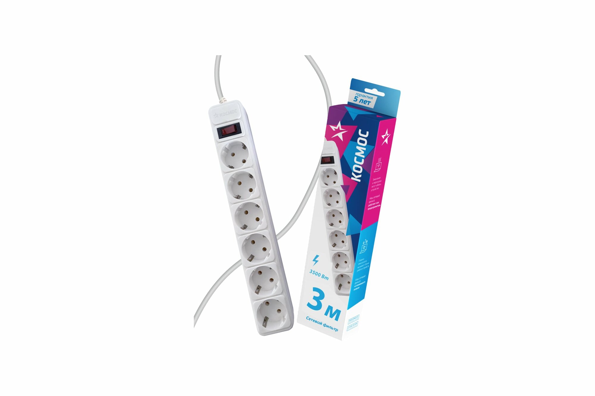 Сетевой фильтр Космос 3м 6 гнезд, белый