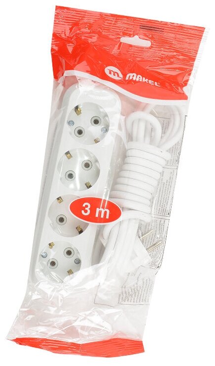 Удлинитель Makel длина 3 м розеток 4 гнезда с заземлением c/з Макел 3х1 ПВС электрический сетевой бытовой 3600 вт 220в белый, арт. MGP153 интересное: