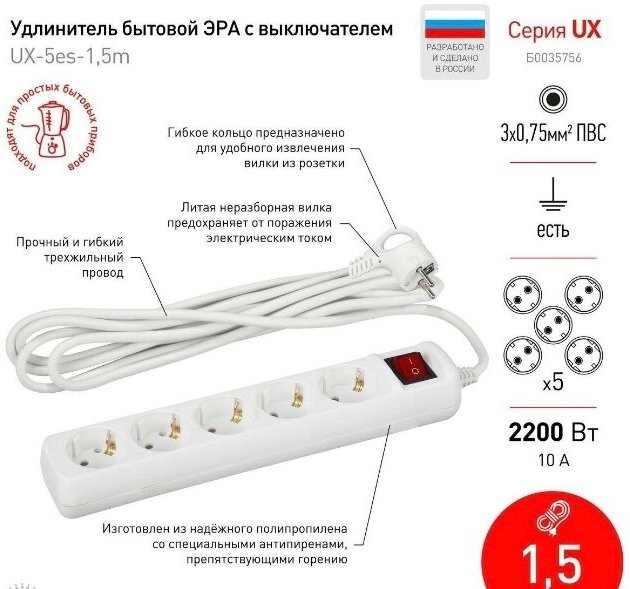 СохранитьЭРА USF-5es-1.5m-W Белый Сетевой фильтр базовая защита, с/з, с выкл, 5гн, 1,5м, ПВС, 10А интересное: