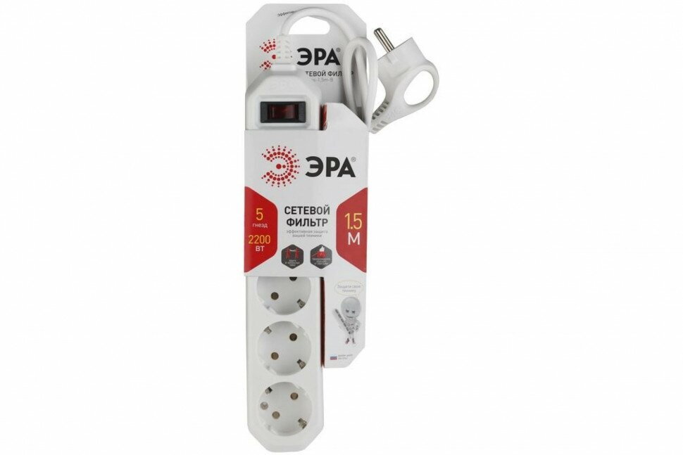 Сетевой фильтр ЭРА USF-5es-1.5m-W с базовой защитой с заземл. с выкл. 5 розеток 1,5м 10А белый