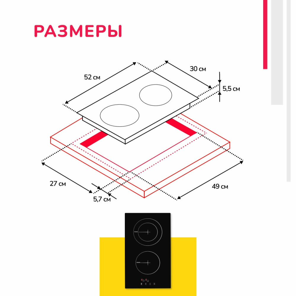 | Плюсы: | Две конфорки хороших размеров (под большую и среднюю посуду). Изза своих габаритов неплохо экономит место на кухне. Сенсорное управление. |