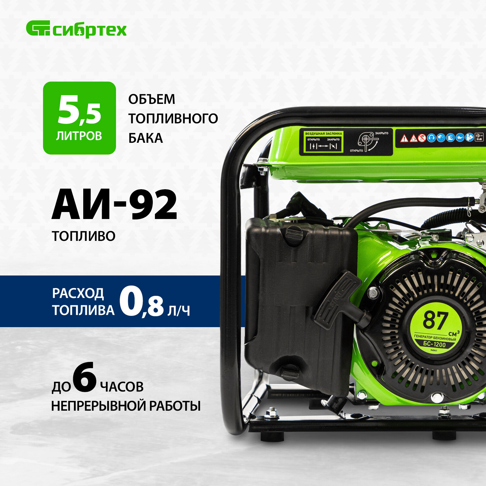 Купить Генератор бензиновый БС-1200, 1 кВт, 230 В, четырехтактный, 5.5 л, ручной стартер Сибртех