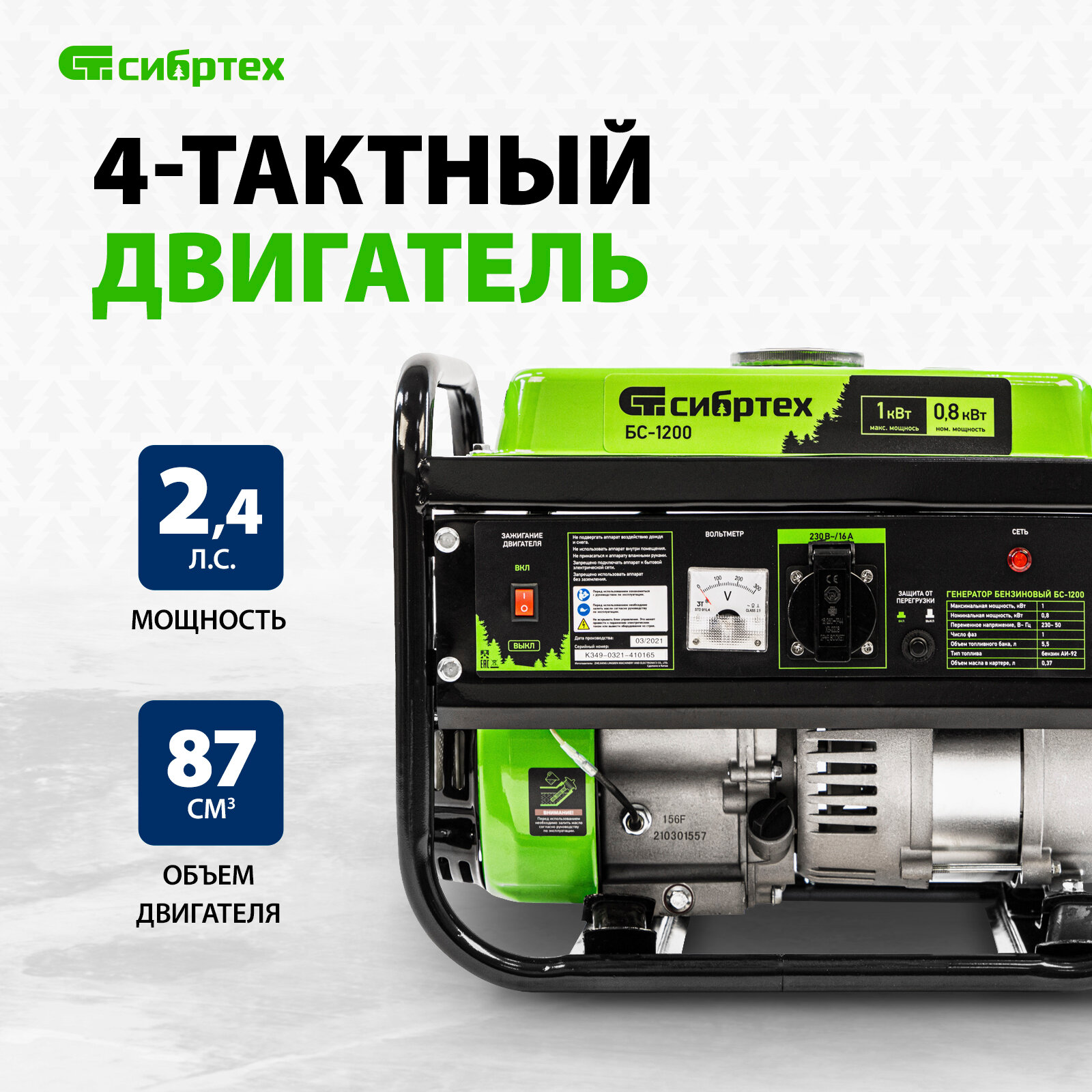 Генератор бензиновый БС-1200, 1 кВт, 230 В, четырехтактный, 5.5 л, ручной стартер Сибртех 94541