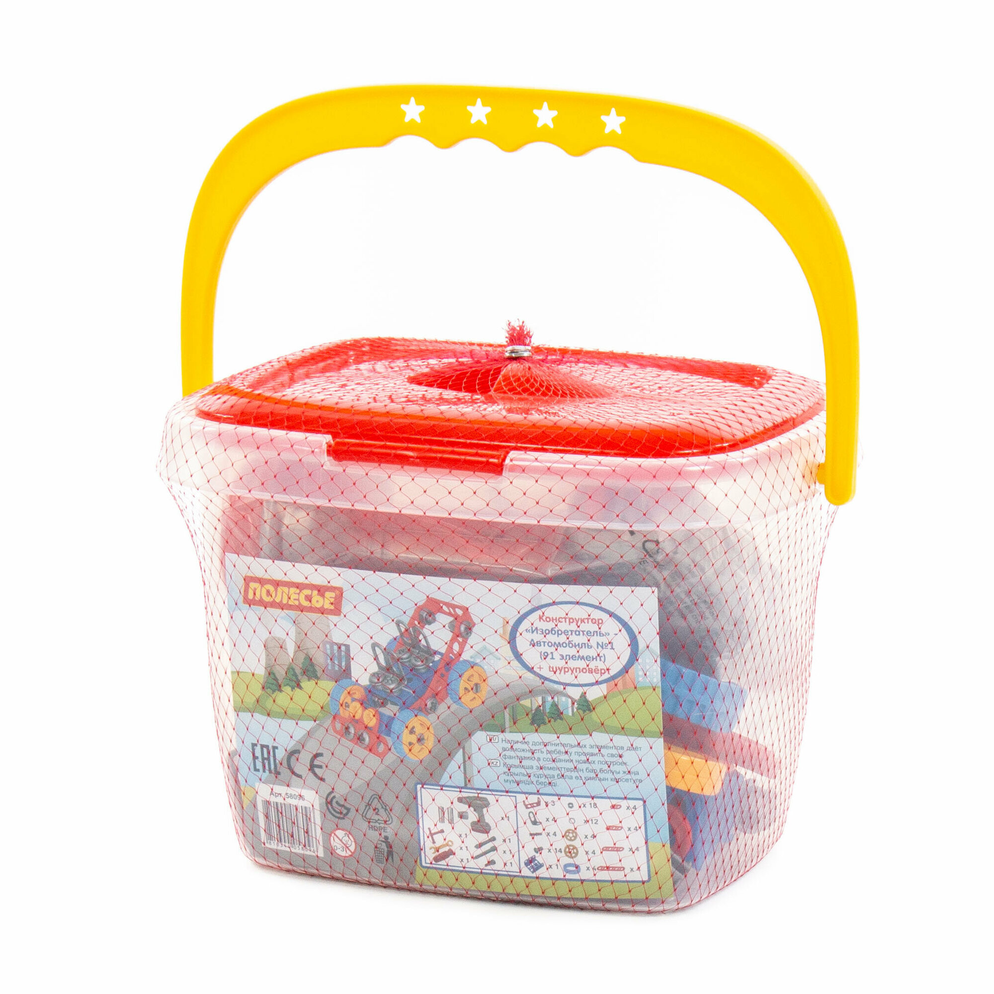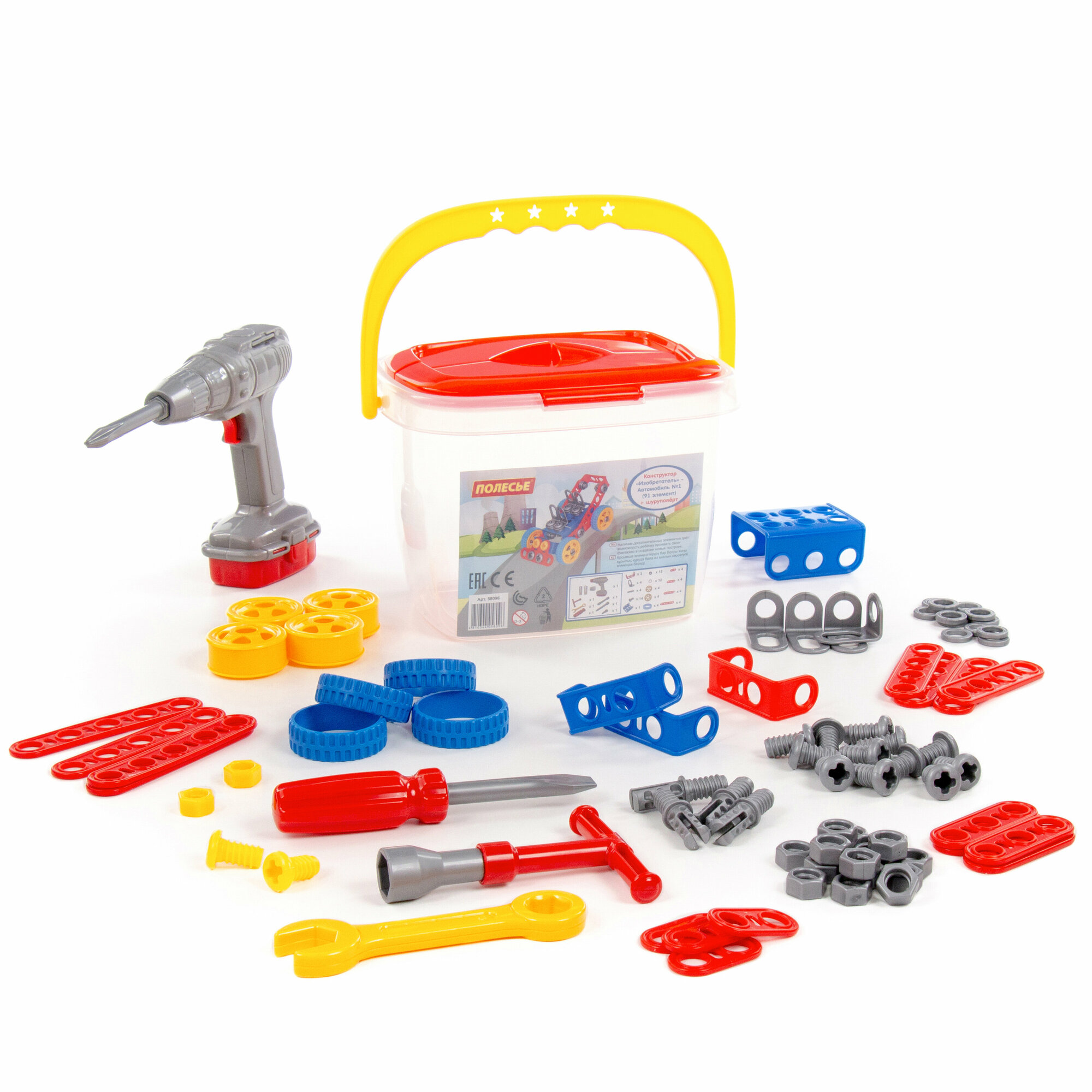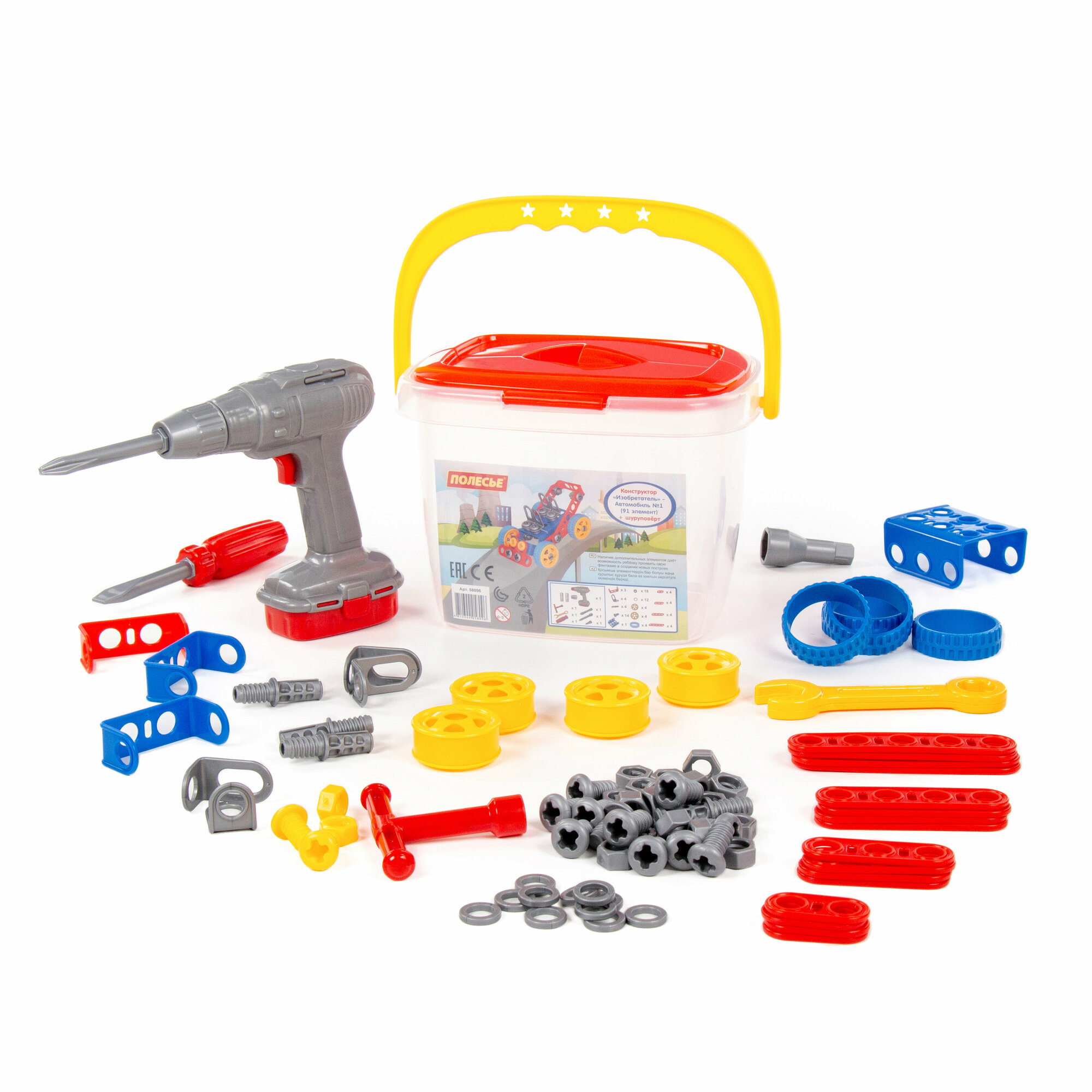 Купить Конструктор Изобретатель Автомобиль №1 91 элемент и шуруповёрт в ведёрке Полесье, 58096