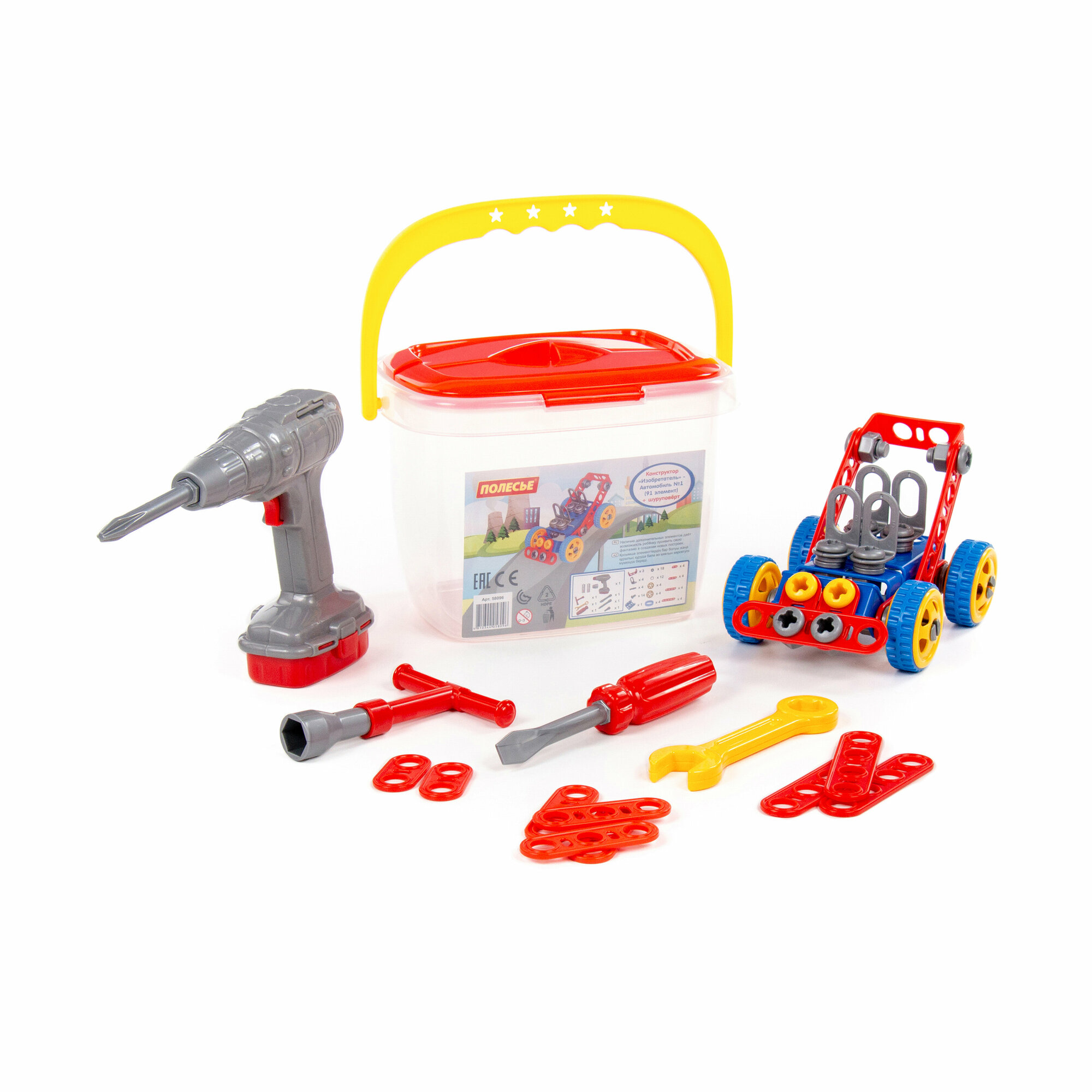 Конструктор "Изобретатель" - "Автомобиль №1" (91 элемент) + шуруповёрт (в ведёрке)