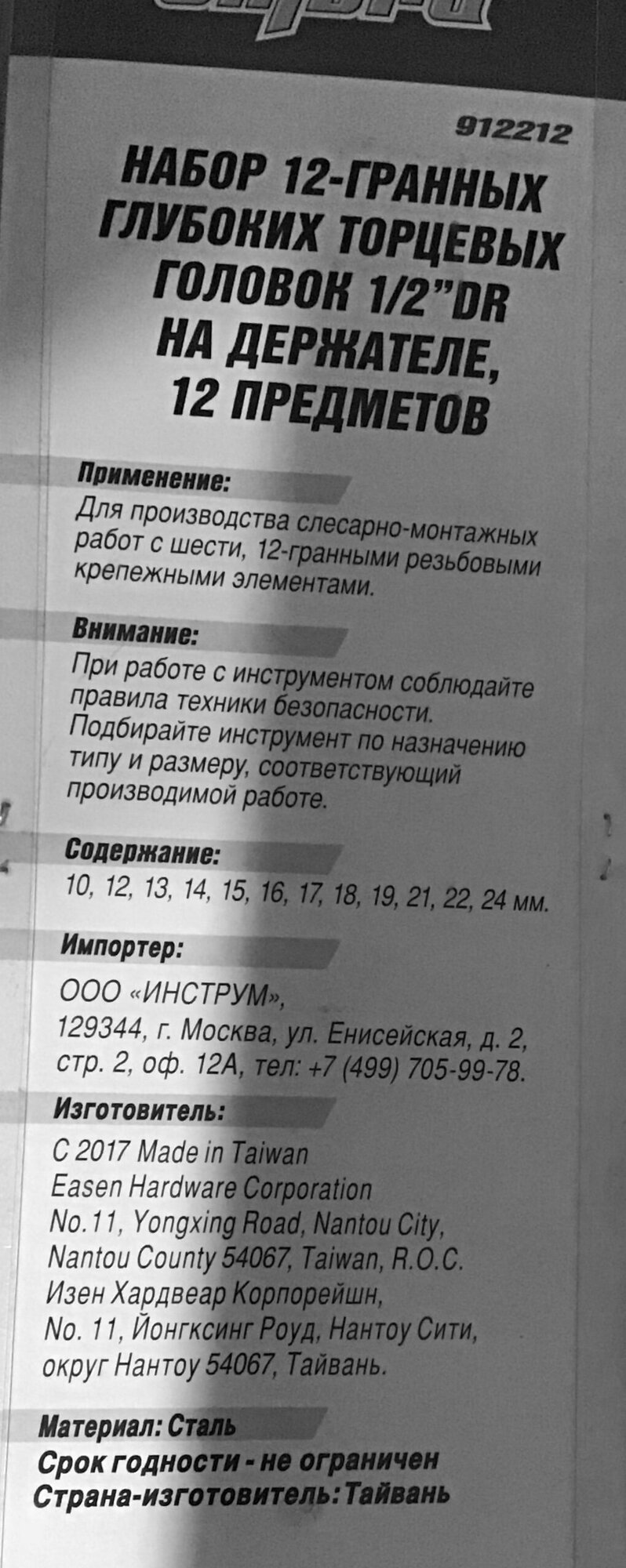 912212 Набор головок торцевых глубоких 12 гранных 1/2"DR на держателе, 10-24 мм, 12 предметов