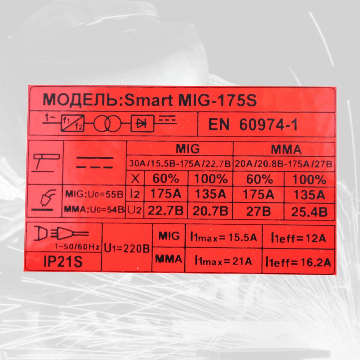 | Сварочный ток (MIG/MAG) | 30-175 А |