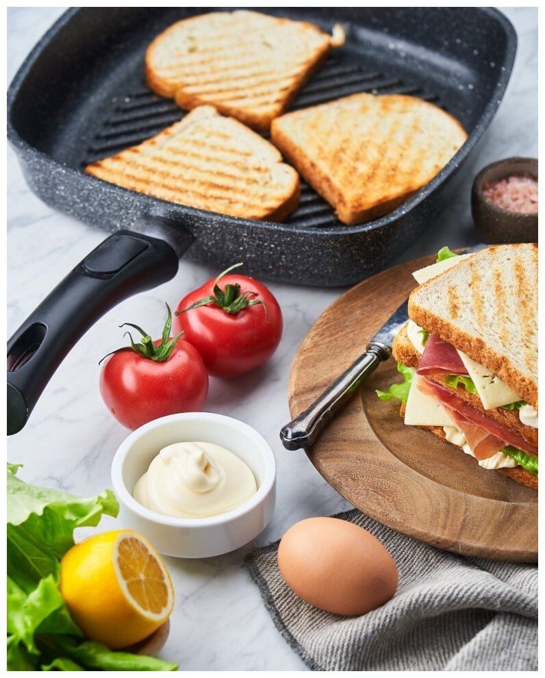 Удобная сковорода, высота ребер достаточна для правильной жарки. Съемная ручка - можно спокойно использовать в духовке, и, главное - занимает мало места.