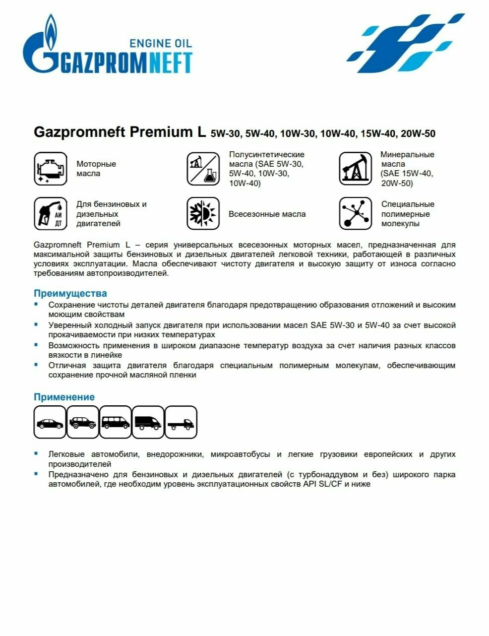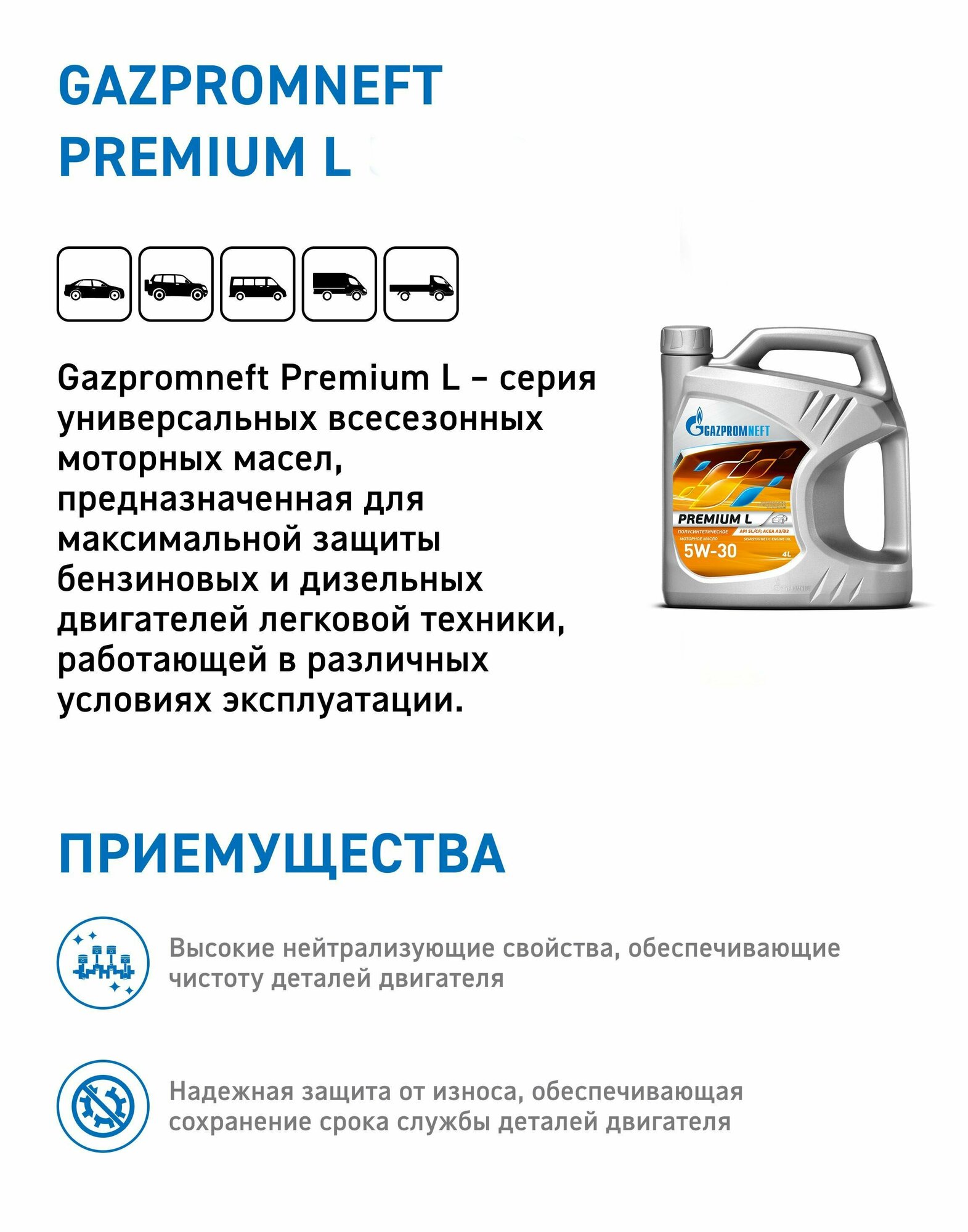 Моторное масло Газпромнефть Премиум L 5w30 API SL/CF ACEA A3/B4 полусинтетическое (Gazpromneft Premium L) 4л.