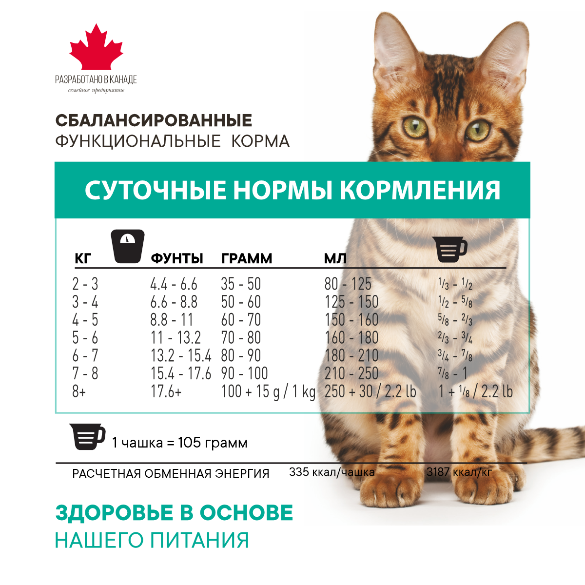 | Дозировка | - вес кошки 2-3 кг - 35-50 г - вес кошки 3-4 кг - 50-60 г - вес кошки 4-5 кг - 60-70 г - вес кошки 5-6 кг - 70-80 г - вес кошки 6-7 кг - 80-90 г - вес кошки 7-8 кг - 90-100 г - вес кошки 8+ кг - 100 + 15 г/кг |