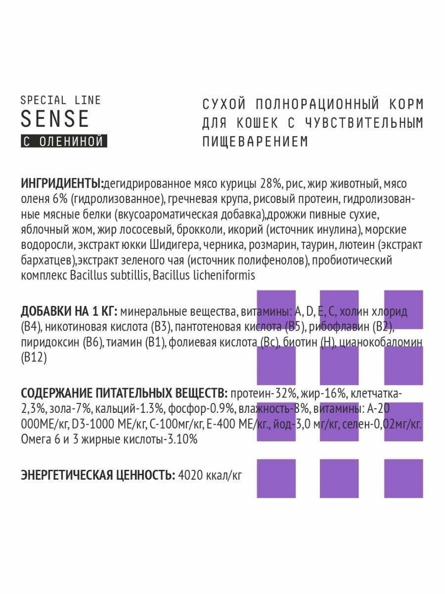 | Состав | дегидрированное мясо курицы 28%, рис, жир животный, мясо оленя 6% (гидролизованное), гречневая крупа, рисовый протеин, гидролизованные мясные белки (вкусоароматическая добавка),дрожжи пивные сухие,яблочный жом,жир лососевый,брокколи,цикорий (источник инулина), морские водоросли,экстракт юкки Шидигера,черника, розмарин, таурин, лютеин (экстракт бархатцев),экстракт зеленого чая (источник полифенолов), пробиотический комплекс Bacillus subtillis, Bacillus licheniformis |