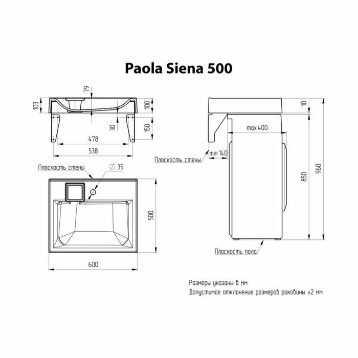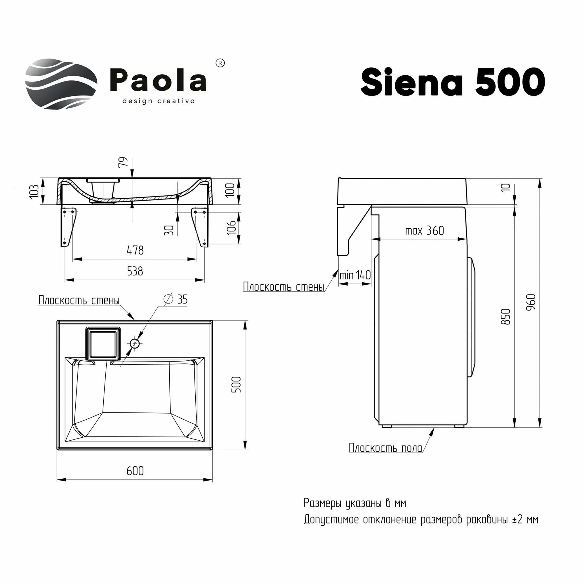 Раковина над стиральной машиной Paola Siena 60х50 с кронштейнами (4660105230762)
