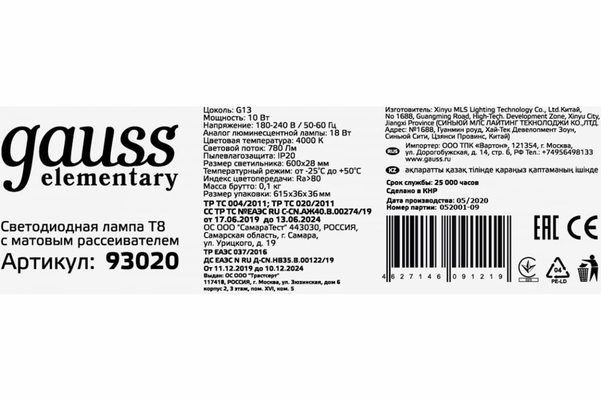 Лампа светодиодная gauss Elementary 93030, G13, T8, 10 Вт, 6500 К